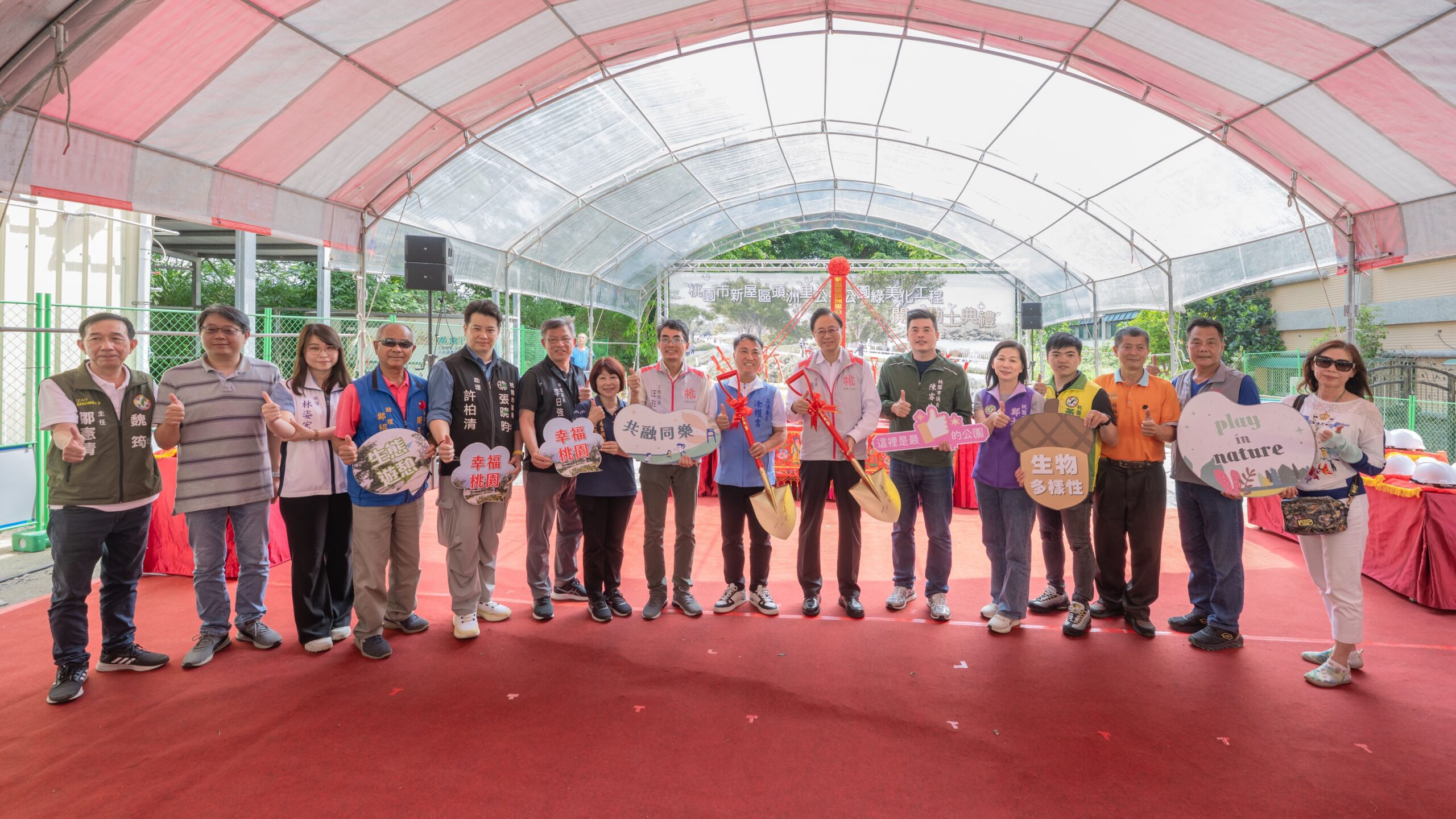 桃園市長張善政(22)日下午前往新屋區,出席「新屋區頭洲里公1公園綠美化工程」開工動土典禮時表示,頭洲公1公園預定地位於新屋區、中壢區及楊梅區交界處,總面積約3公頃,第一期工程基地面積約0.16公頃。打造兩條鄰近埤塘的水畔步道,是整體公園開闢計畫的重要開端,期勉施工團隊如期如質完工,提供在地鄉親優質休憩場域。