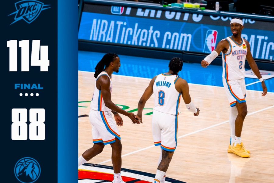 美國職籃(NBA)西區決賽首戰在19日展開,由雷霆迎戰灰狼大軍的來襲。上半場兩隊還打得難分難解,主場的雷霆下半場火力全開,球星「SGA」亞歷山大(Shai Gilgeous-Alexander)第三節12分的帶領下,打出32:18的攻勢反超比分。末節雷霆更是人人皆兵強攻38分,半場海灌70分,終場以114:88電暈灰狼,奪下西區決賽首勝。