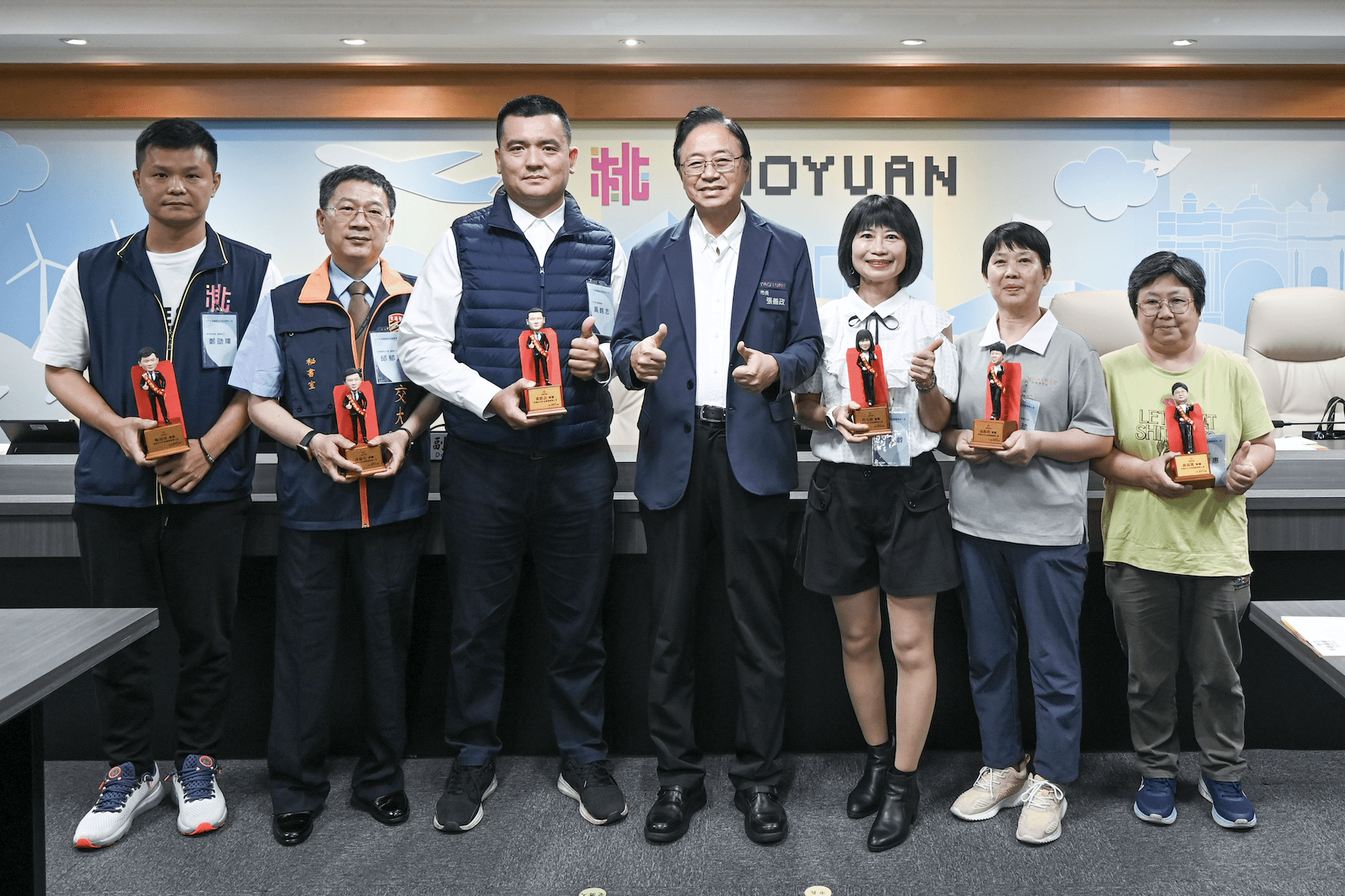 桃園市長張善政(5)日下午主持市政會議,表揚桃園市113年各機關學校績優事務人員時表示,恭喜所有獲獎的績優技工、工友與駕駛人員,因其平時在基層默默付出,才能讓機關、學校順利運作。張善政也代表桃市府向最辛苦的基層幕後功臣致上最深的感謝與敬意。