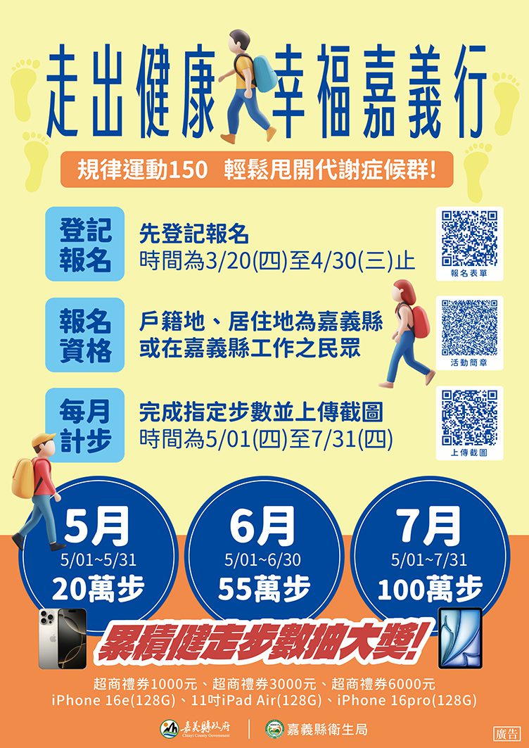 根據近5年成人預防保健服務數據顯示,40歲至64歲接受檢查的民眾中,約有3成2符合代謝症候群標準,而規律運動是最有效的預防方法之一。為此,嘉義縣衛生局自5月1日起至7月31日止舉辦「走出健康,幸福嘉義行」健走活動,吸引1,295人報名參加,凡於每月達成指定步數任務者,即有機會抽中蘋果手機、獎金禮券等豐富好禮。