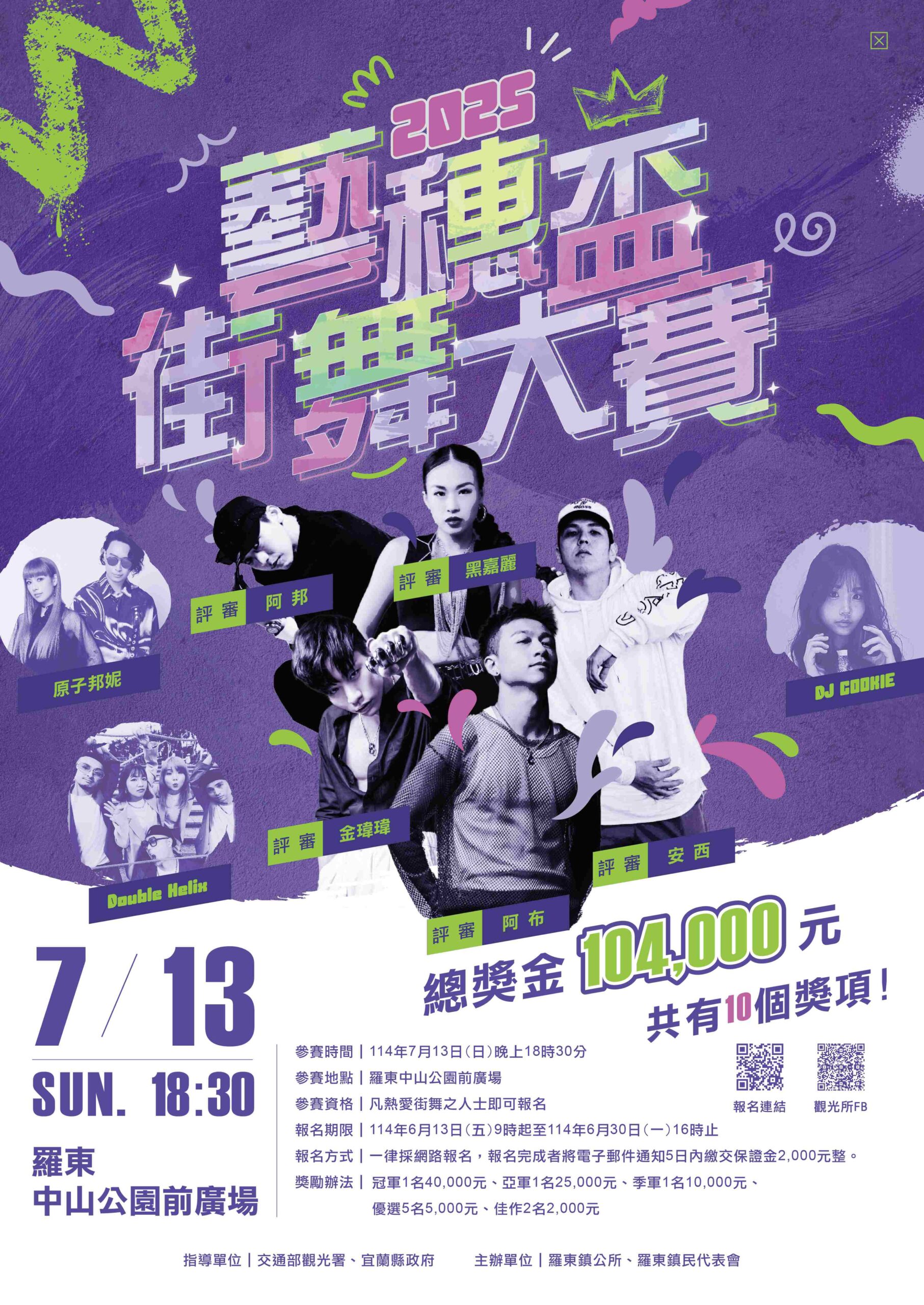 2025羅東藝穗節將於7月12日開幕,人氣最高「藝穗盃街舞大賽」緊接著在7月13日登場,羅東鎮公所今年邀請「原子邦妮」一起High翻羅東中山公園!預計頒發獎項有冠軍隊、亞軍隊、季軍隊,優選5隊及佳作2隊,總獎金高達10萬4仟元!