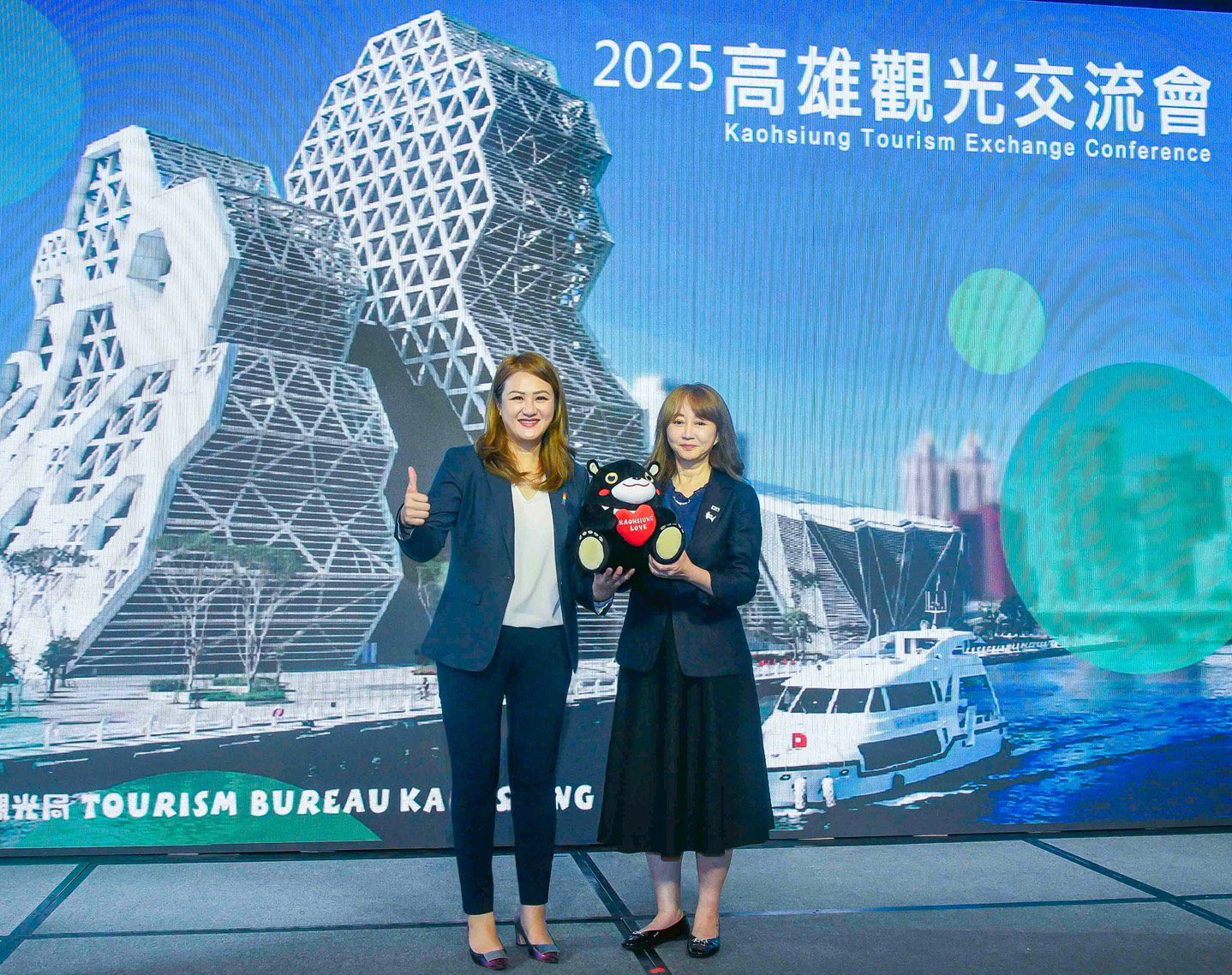 ▲觀光局長高閔琳致贈高雄吉祥物「高雄熊」給台灣觀光協會簡余晏會長,展現高雄觀光魅力與親和力。(圖/高雄市政府觀光局提供)