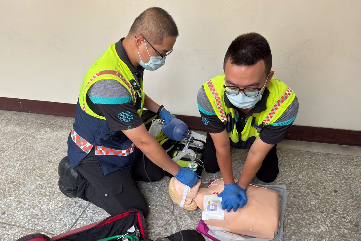 ▲和美消防分隊高級救護員林建宏與陳甄鴻火速趕抵,到達現場即確認患者無呼吸、無脈搏,立即施行高品質CPR並啟用AED(自動體外電擊器)進行電擊。(圖/彰基提供)