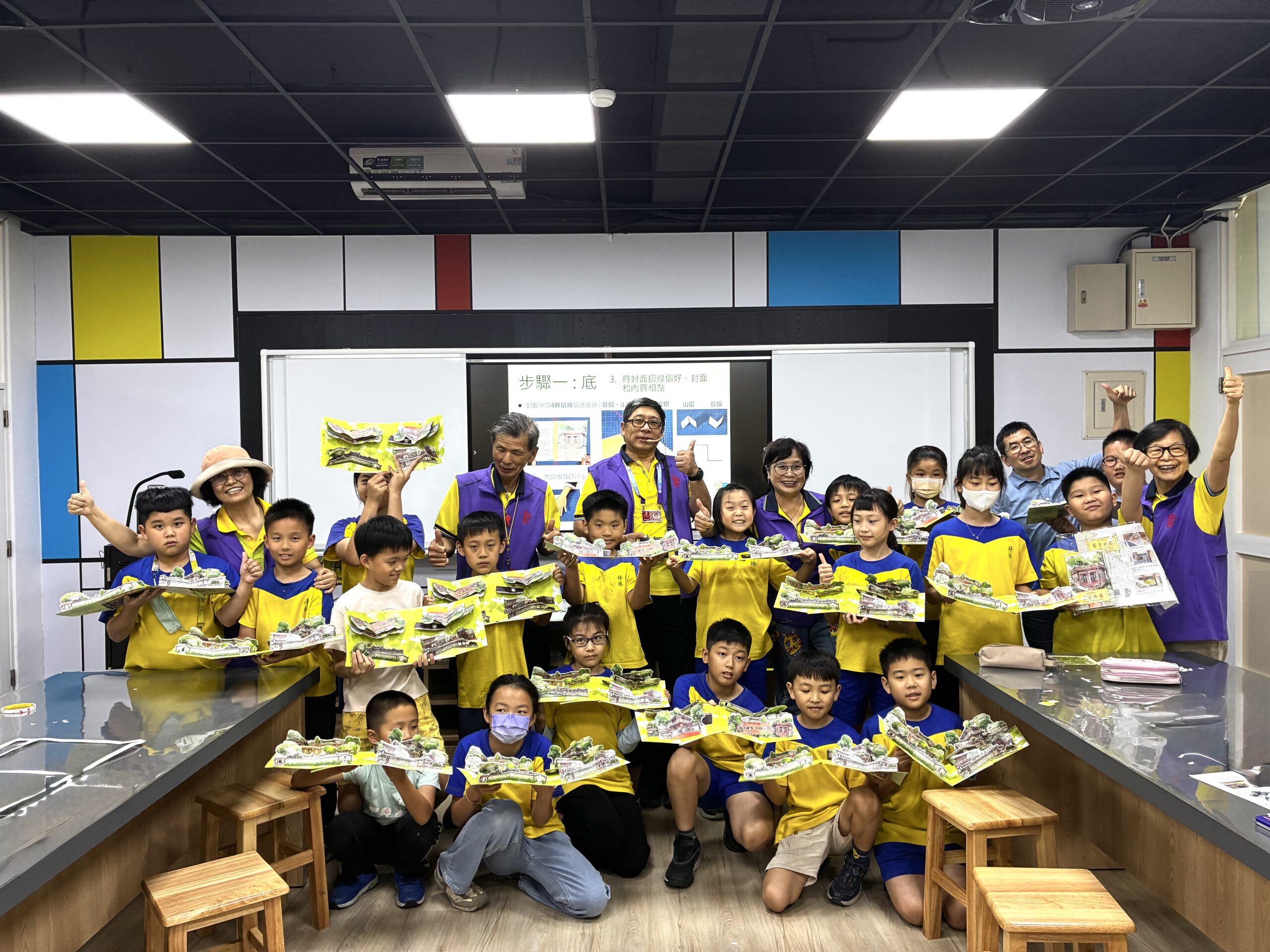 ▲坪林國小的學生們開心展示自己親手製作的「紙上林園」。(圖/新北市文化局 提供)