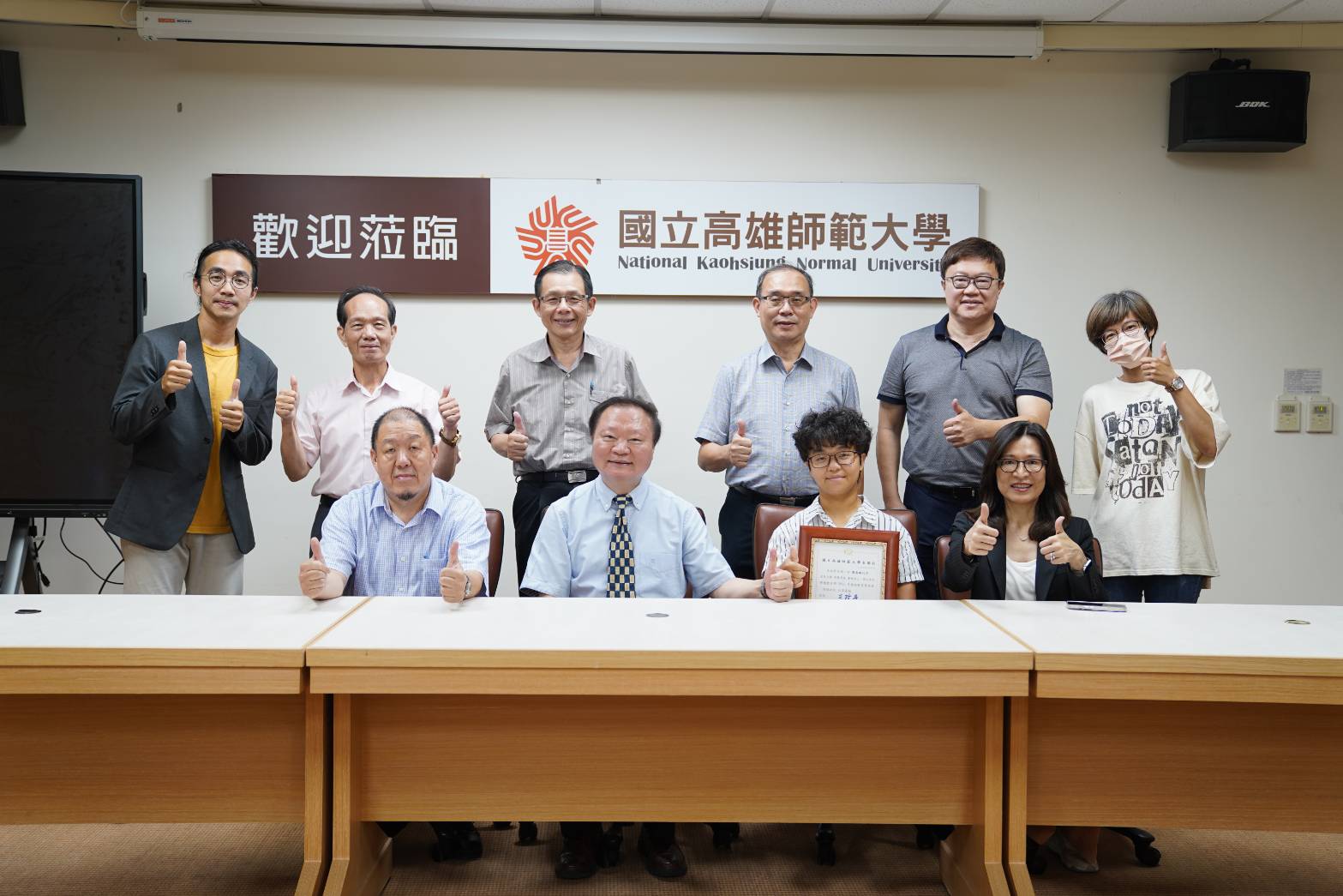 國立高雄師範大學美術系碩士生蔡奕琳同學,榮獲「2025年總統教育獎」殊榮,校長王政彥偕同唐副校長與李副校長及杜學務長、藝術學院陳院長、美術系李主任、鄂執行長等多位師長,於今(9)日上午假行政大樓5樓簡報室,特別頒發表揚狀及禮品,以表彰其克服困難堅韌不拔的傑出表現。