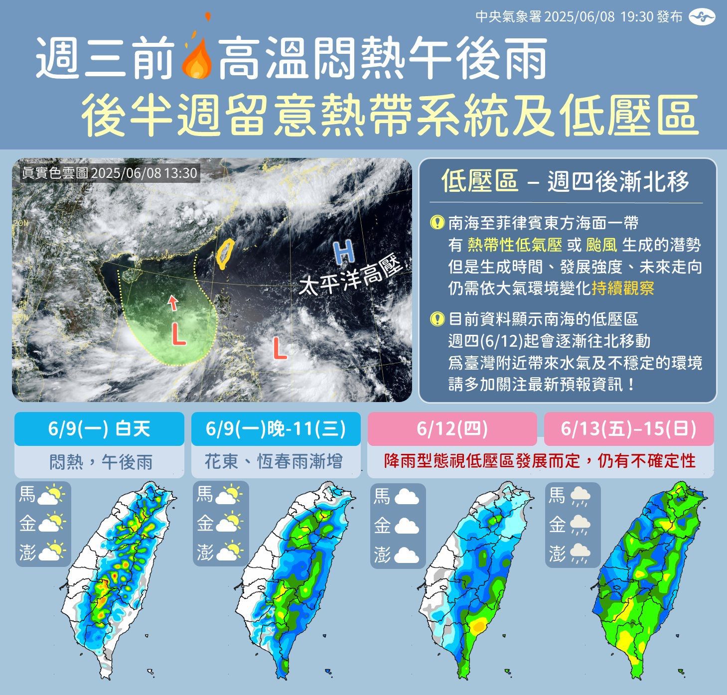 進入周五~周日(6/13~6/15)臺灣附近為低壓區影響,或以南風、西南風為主的環境,容易有比較多的水氣,其中迎風面中南部、東南部地區天氣上會較為不穩定,其他地區也要留意午後雷陣雨。再次提醒,後期的天氣變數仍比較大,若這段時間有安排活動,得多留意最新的預報資訊。