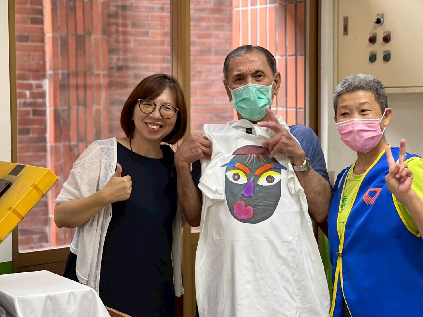 南老長輩平日在機構的生活豐富,除了安排不同的社團、音樂體適能、宗教活動、手作活動等,故於今日服裝選購的會場中,我們特別將長輩於手作社團中的面具圖騰成品與活動主旨結合,利用熱燙印的方式將生動臉孔轉印在服裝上呈現,阿榮長輩驚呼「我成為服裝設計師」露出開心自信的笑容。這些作品擇日亦將於太平洋百貨站展出。