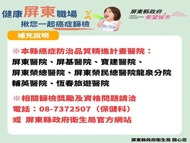 ▲即早發現、即早轉介、即早治療,癌篩專線(08)738-0995洽詢(圖/屏東縣政府衛生局)