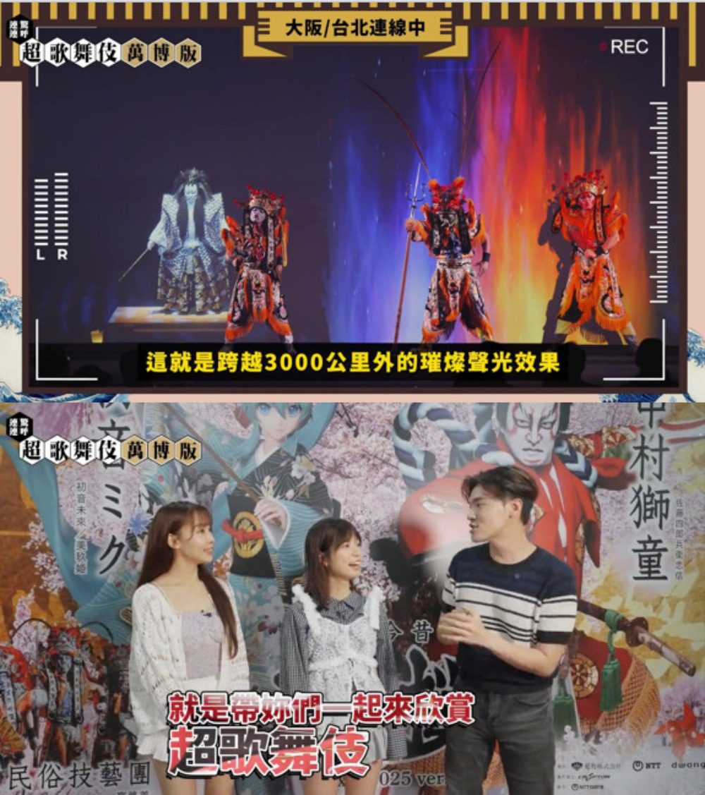 演出當天,台北現場由台灣九天民俗技藝團率先登台,帶來極具本土特色的廟會陣頭,每位演出者臉上彩繪著代表神祇的臉譜,為現場增添強烈儀式氛圍與文化能量。緊接著由歌舞伎名家中村獅童、澤村精四郎與虛擬歌手初音未來聯袂主演,集結頂尖卡司陣容的《今昔饗宴千本櫻 萬博版》正式登場,透過18米寬的巨型投影牆,將大阪現場的璀璨聲光效果,忠實呈現在台北舞台上,每一處細節與情感流動都被清晰捕捉,視覺震撼十足。