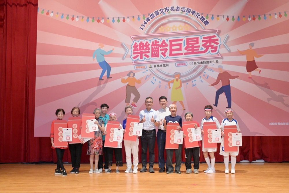 臺北市政府衛生局誠邀長輩朋友一同參加「樂齡巨星秀」活動,相約每年一起組隊展現健康活力,豐富樂齡人生。臺北市政府衛生局持續推動長者健康服務,包含老人健康檢查、營養諮詢及篩檢、辦理健康促進活動及課程、疫苗接種、社區心理支持、長照服務等,讓長輩們在熟悉的環境中快樂、健康的生活,老得健康、活得精彩。