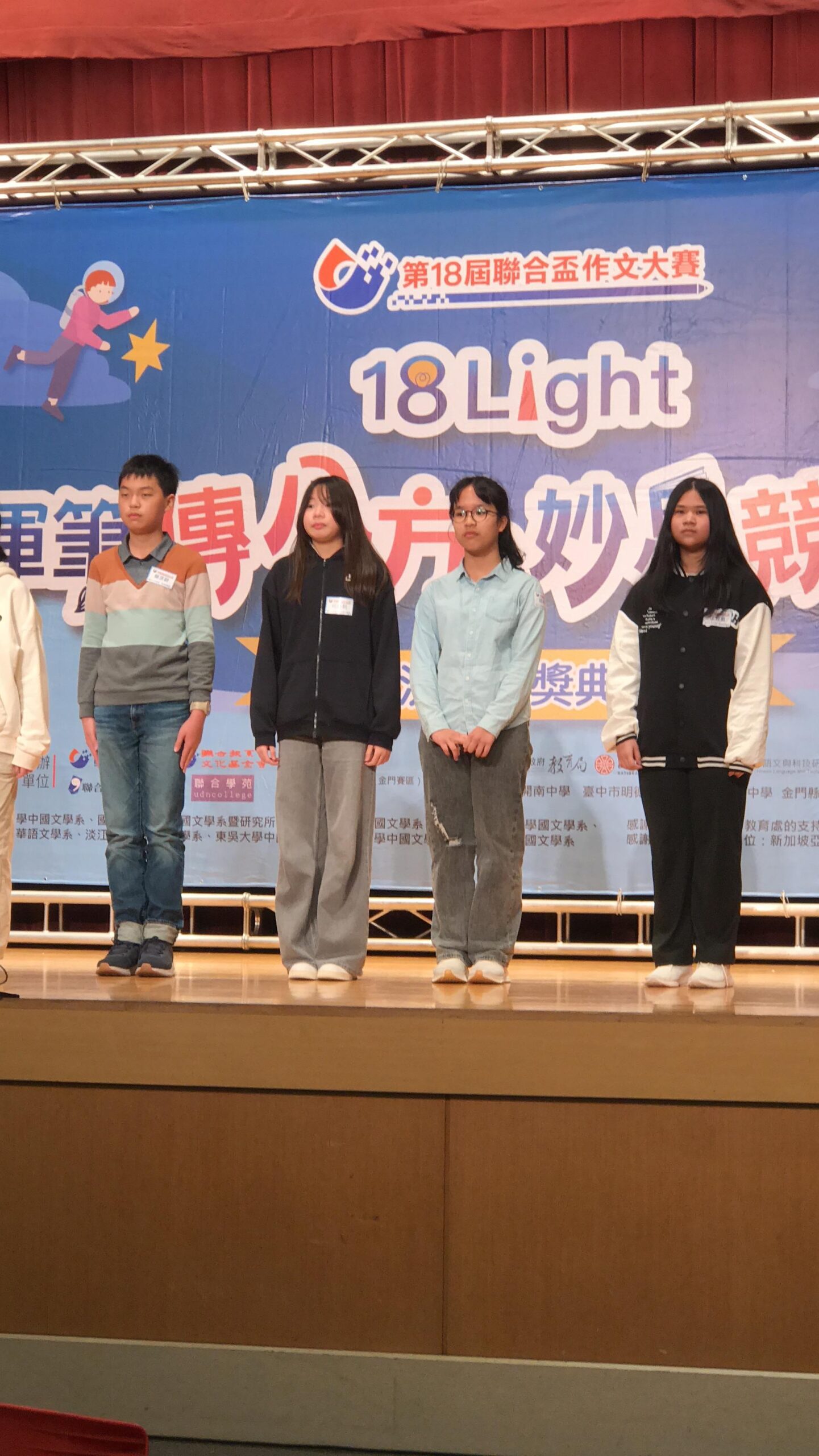 第18屆聯合盃作文大賽獲獎名單如下:國小高年級組首獎:慈大附小林子軒;國小中年級組感動類優選:明義國小黃映文;國小高年級組創意類優選:海星國小范剛維;國中七年級組創意類優選:國風國中邱卉卉。