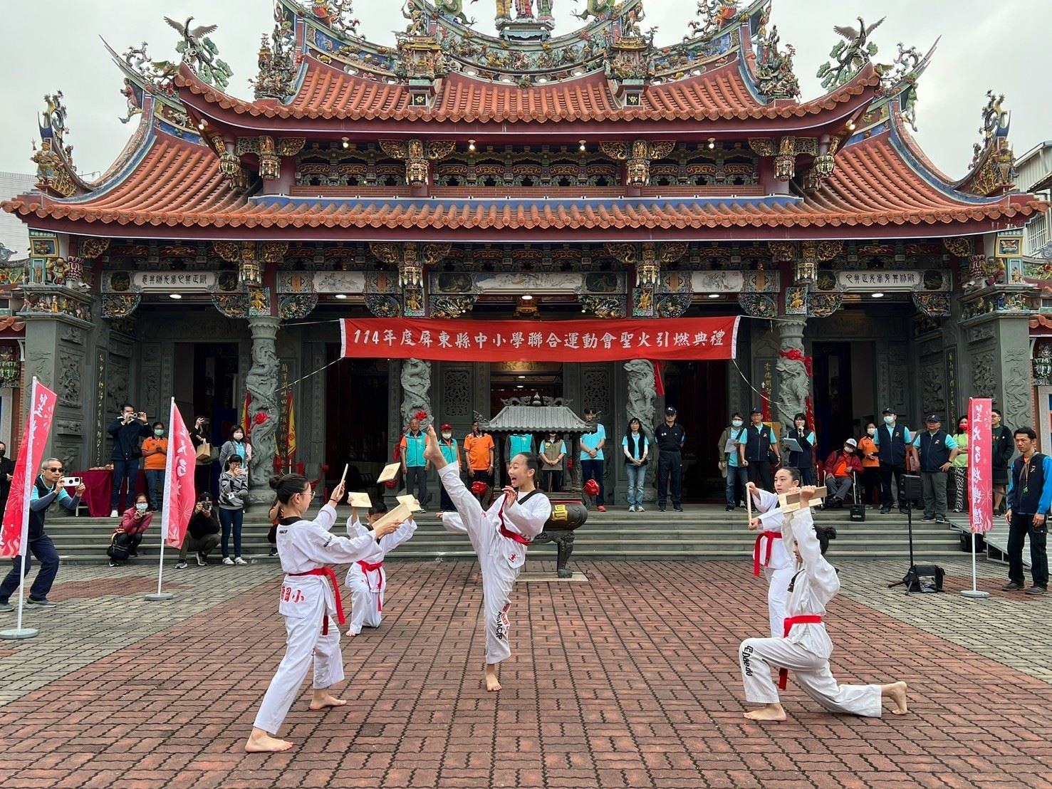 今日,中小運於崇蘭昌黎殿舉行隆重的祈福儀式,在崇蘭國小帶來氣勢磅礡的跆拳道表演後,聖火正式點燃,為賽事揭開序幕。開幕典禮隨後於田徑場熱鬧登場,由屏榮高級中學帶來活力四射的熱舞演出,為賽會增添動感氛圍。緊接著,由崇文國中70位學生聯手呈現拳擊有氧表演,震撼全場,展現青春活力與運動精神,為大會增添滿滿熱情。