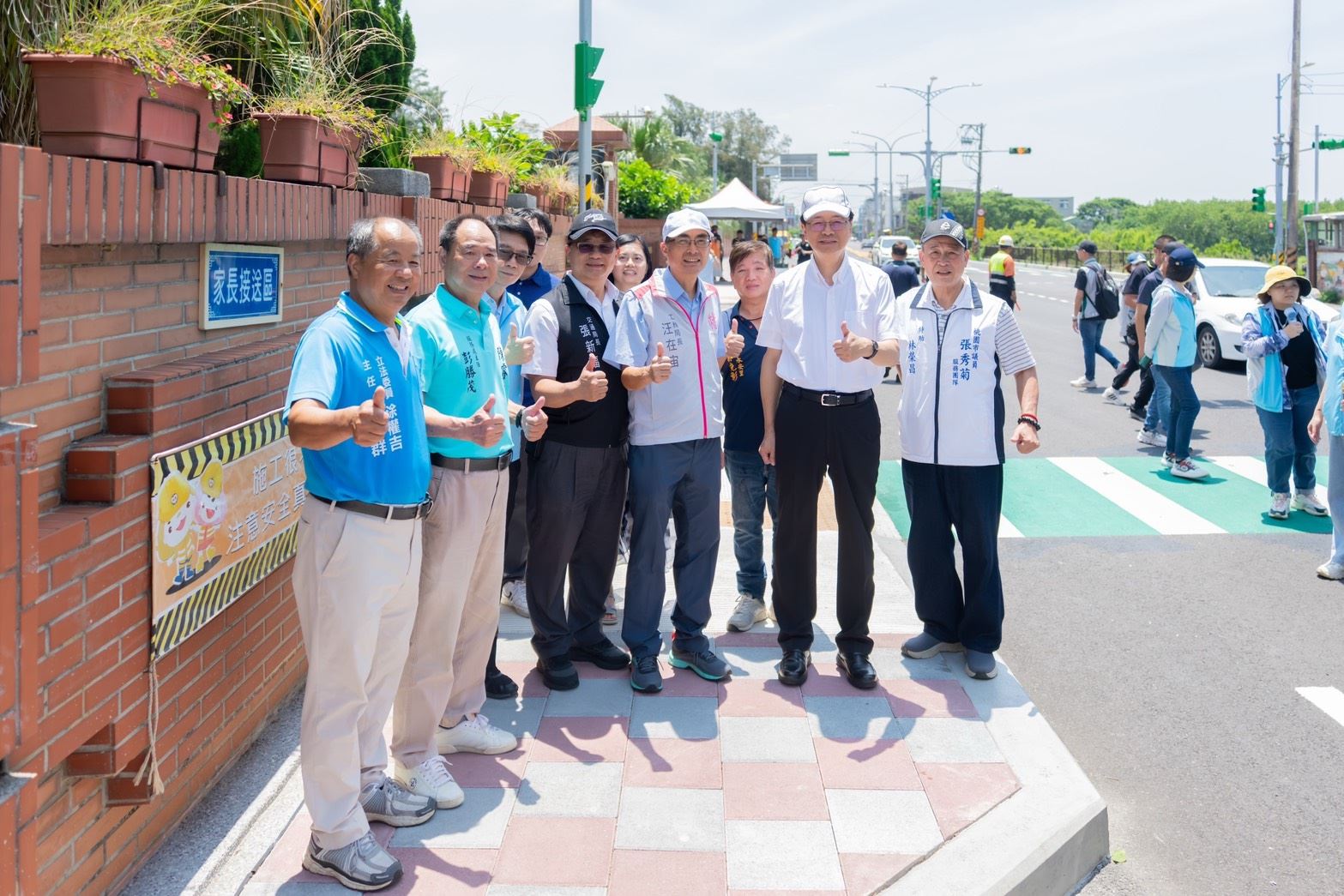 張善政說明,此次工程除遵循標準工法外,更導入創新環保材料,包括以100%再生再利用粒料進行施工,例如以煉鋼產業的副產物轉爐石取代傳統鋪面材料,降低天然資源消耗;人行道則採用焚化再生粒料製作的高壓地磚,提升排水效率與止滑效果;路口處設置雙色溫LED照明,強化通學時段之安全辨識度。