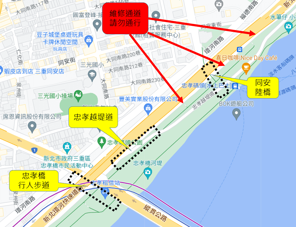 (二) 忠孝碼頭越堤道於12時至16時車輛只出不進,16時起至23時禁止車輛進入與停放。