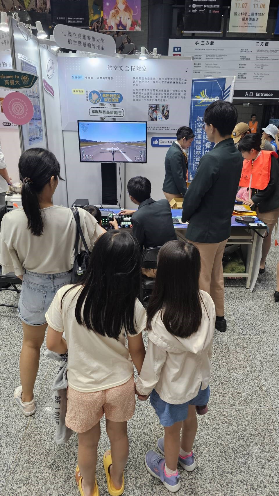 今年的活動中,高餐大航空暨運輸服務管理系由王穎駿主任親自帶隊,結合師生專業能力,設計出「航空器模擬操作」與「救生衣穿戴教學」體驗。孩子們在老師與學生的指導下,現場學習登機後如何穿戴救生衣、遇到緊急狀況該如何應對,以及簡單的模擬飛行體驗,讓孩子們宛如小小機長,樂在其中。家長們也表示:「原來開飛機不只是遙不可及的夢想,也讓孩子們對航空產生濃厚興趣!」