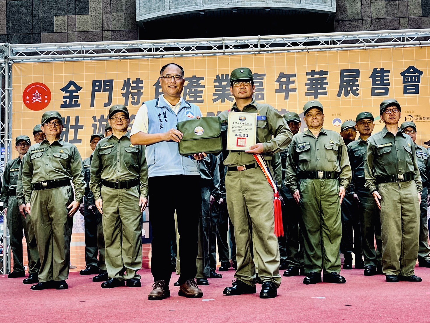 金門縣副縣長李文良表示,金門縣政府近年來積極推動多元主題觀光,「金門老兵召集令」自107年起舉辦至今,已成為金門具有品牌效應的觀光活動之一。今天特別在縣府舉辦的「金門厚禮」特產展售中,邀請老兵們共同參與軍歌快閃活動。今年活動不僅邀請老兵重返軍旅記憶,更希望透過融入懷舊元素,促進老兵社群互動,並振興金門疫後觀光發展,現場除致贈參與表演老兵感謝狀,同時也致贈印有活動主視覺的莒光袋,引發老兵共鳴。