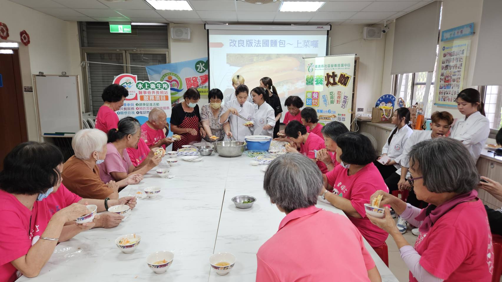 為提升長者飲食營養識能並促進世代互動,水上鄉衛生所醫事C據點規劃「邊煮邊學」的輕鬆廚房體驗課,以長者三好一巧(吃得下、吃得對、吃得巧)的飲食原則為核心,由萬能工商餐飲科教師設計好吞咬的「越南春捲及改良版法國麵包」等多道料理,現場氣氛熱絡。