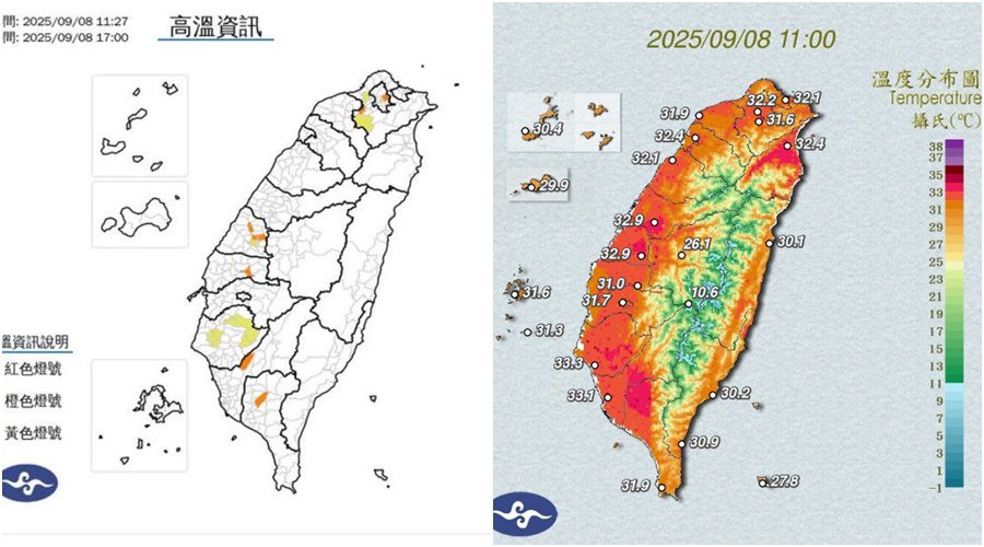 今天9月8日各地持續高溫炎熱,白天臺北市、新北市、彰化縣、雲林縣、高雄市、屏東縣,有連續3天36度以上高溫的機率;臺南市亦有36度以上的高溫。請注意避免非必要的戶外活動,做好防曬、多補充水份、慎防熱傷害。有多處地方出現過量級和危險級的紫外線指數,請注意。