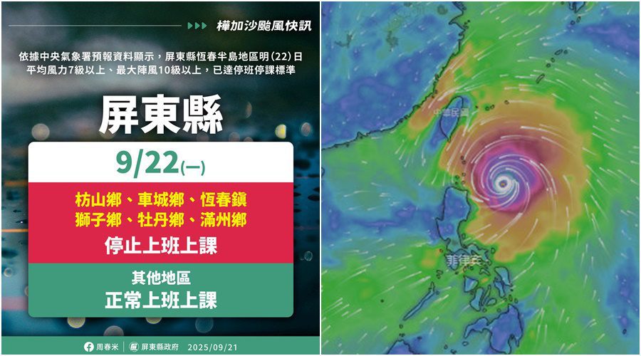 受強颱樺加沙影響 屏東及臺東8鄉鎮0922停班停課 2025 年 9 月 25 日 生活中心∕綜合報導 受強烈颱風樺加沙影響,屏東縣恆春、車城、滿州、枋山、獅子、牡丹等鄉鎮,以及臺東縣蘭嶼鄉和綠島鄉,風力已達停班停課標準,明天9月22日停止上班、停止上課。