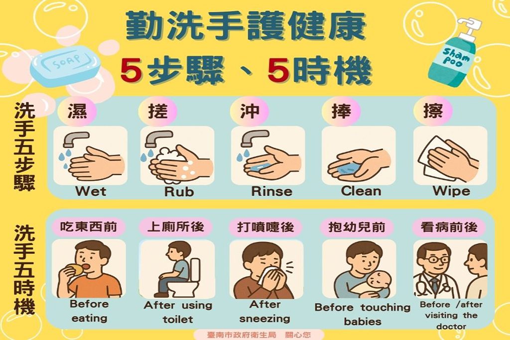 臺南市政府衛生局再次呼籲,應養成勤洗手的良好習慣,透過洗手五步驟(濕、搓、沖、捧、擦)及洗手五時機(吃東西前、上廁所後、打鼻涕後、抱幼兒前、 看病前後),保護自己和家人的健康。