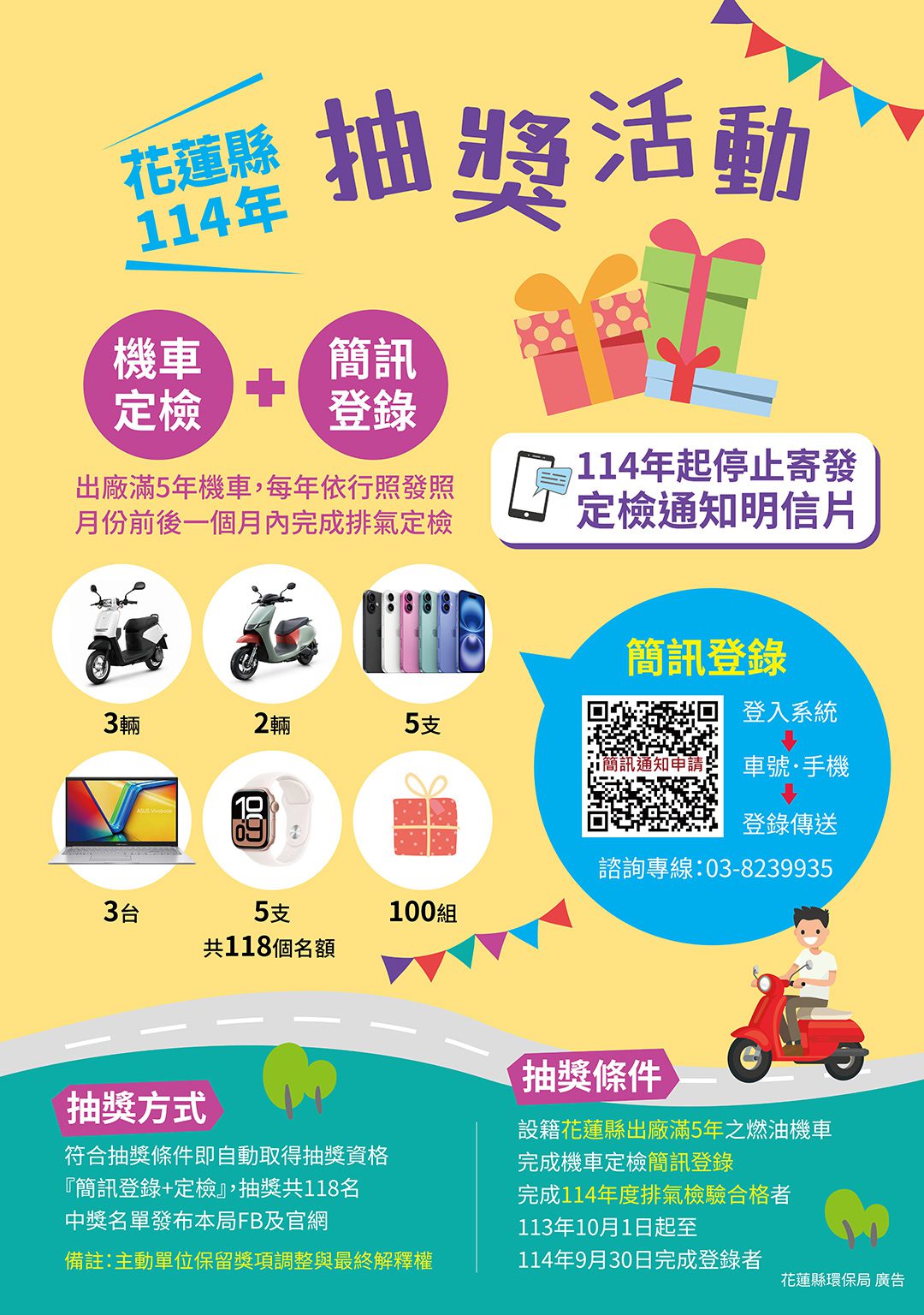 最後,花蓮縣環保局114年辦理的『機車定檢簡訊登錄抽獎活動』,設籍花蓮縣的機車,只要在今年9月30日前完成簡訊登錄,並完成當年度排氣定期檢驗的車主即符合抽獎資格,抽獎獎項包括,電動機車、電動自行車、筆電、手機、智慧手錶等多項大獎,琳瑯滿目。