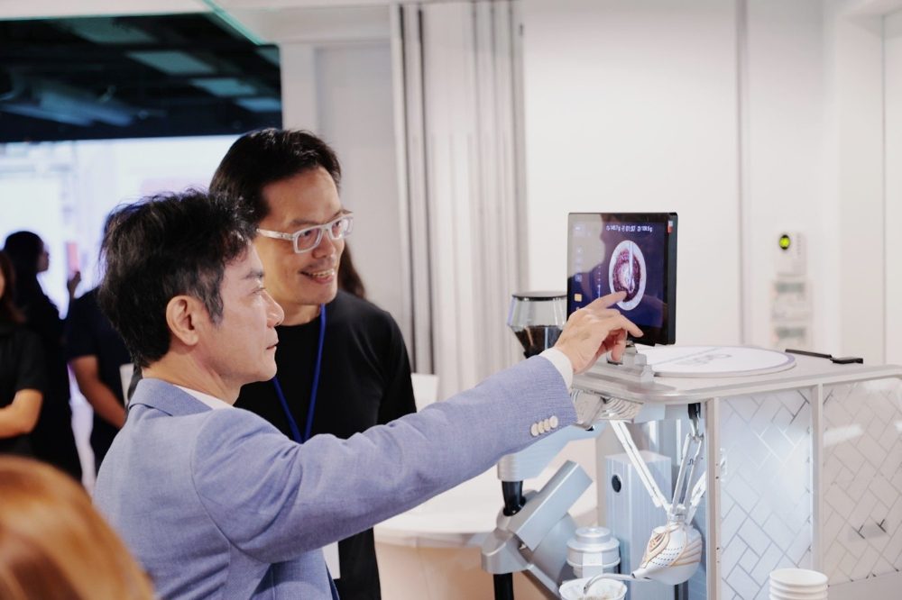 ▲ 資策會董事長黃仲銘(圖左)親自體驗AI手沖咖啡,讓喝咖啡也可以很「科技」。(圖/資策會提供)