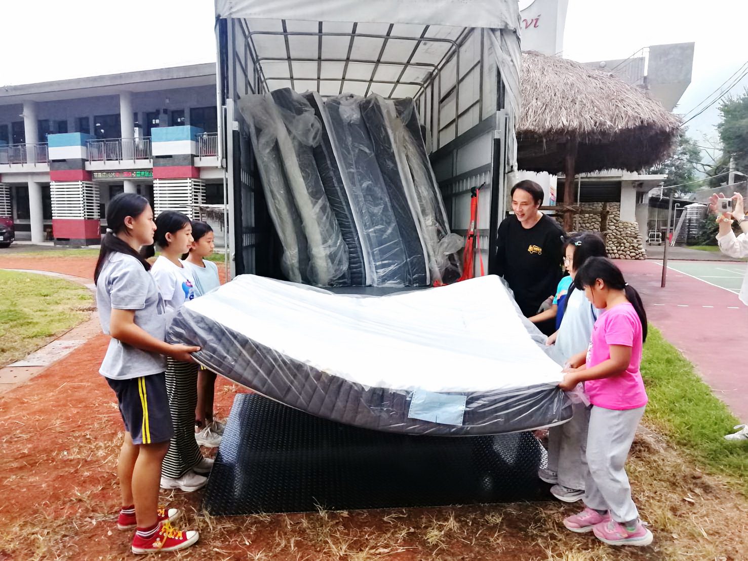 昨天下午,Emma公司專人專車把床墊送上山,司機山路繞半天還差點走錯路。但車子一進校園,小朋友都很興奮,中高年級被叫出來幫忙搬床,嘿咻嘿咻努力抬床,先搬到教室騎樓,等各自家長來載。