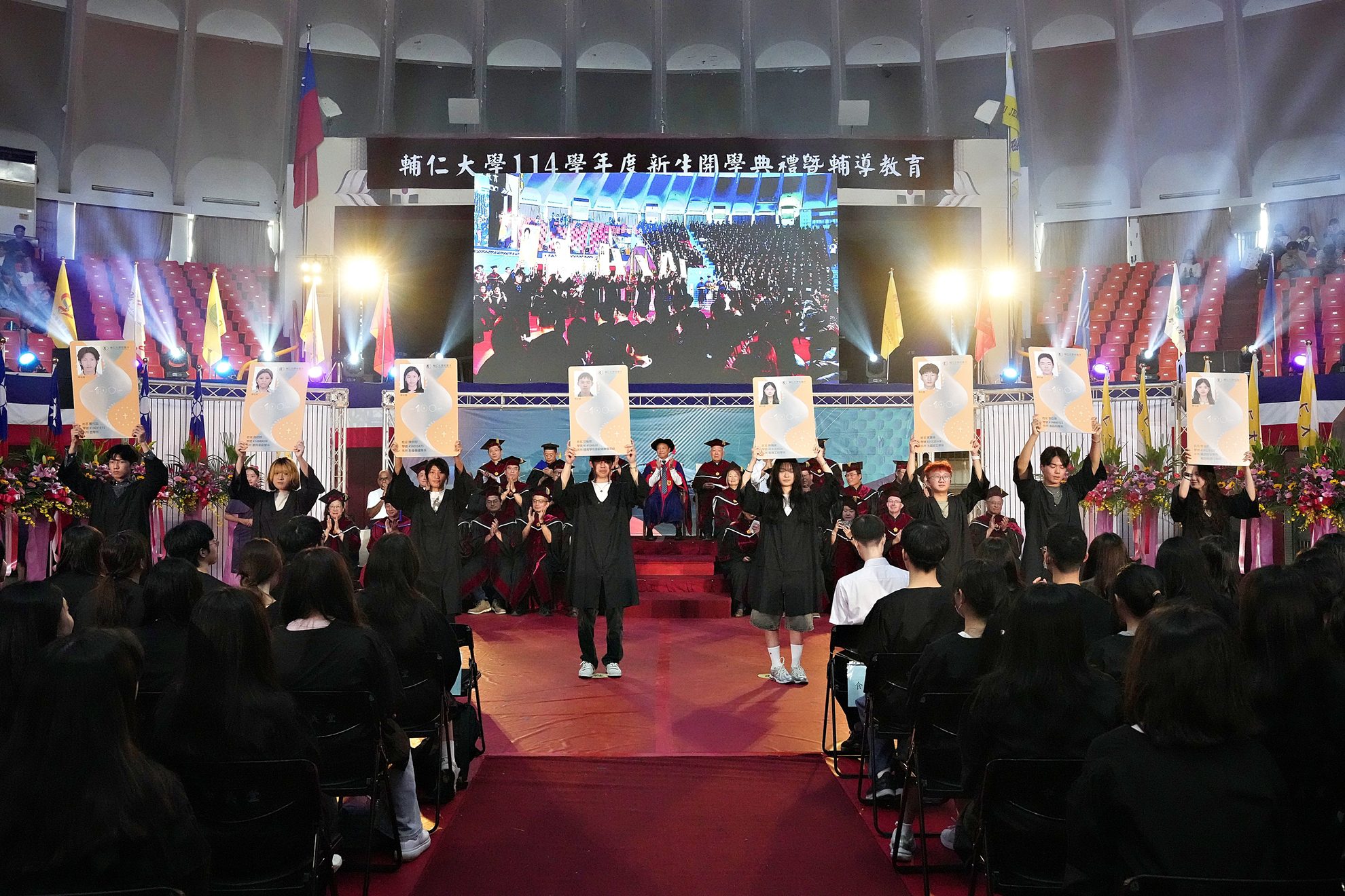 典禮延續傳統,校牧何萬福神父為所有人進行祈福禮,恭讀智慧書證道;同時,安排源自歐洲天主教大學特有的「叩門禮」,新生代表自所屬院長手中接過學生證,象徵即將展開全新大學生活。綜觀這屆新生代表,除了學業表現還有多位具有體育專長,像是金融與國際企業系黃郁琪曾為北一女網球隊隊長,法律系段力平曾獲高市中等學校運動會羽球混合雙打八強,影傳系陳妍均曾獲113年台中盃全國田徑賽三級跳遠冠軍,織品服裝系林佳昕獲「瑪吉斯盃高中女子團體桌球賽」冠軍。