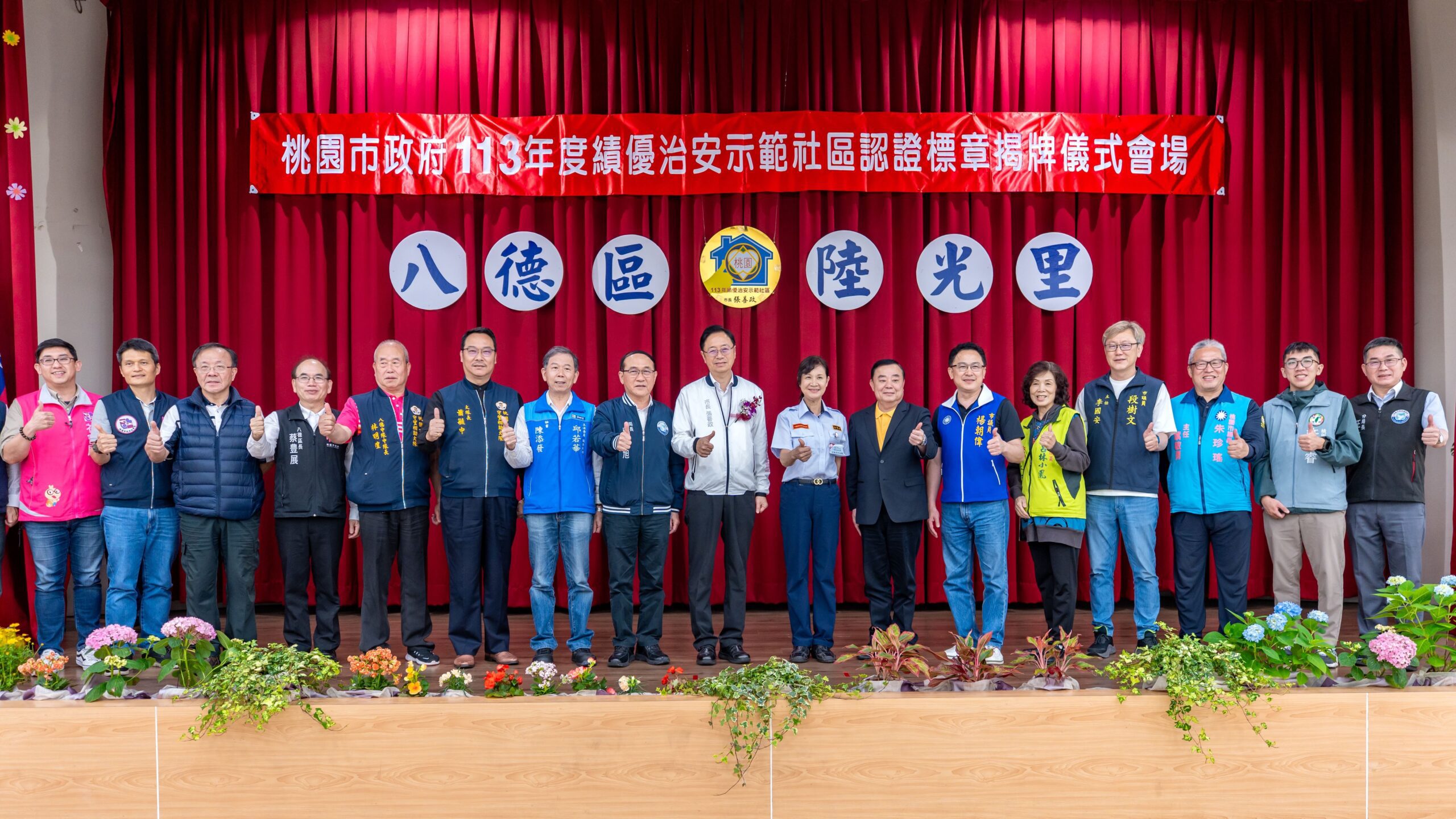 桃園市長張善政(28)日下午前往八德區陸光里,出席「113年績優治安社區認證標章頒獎典禮」時表示,陸光里自投入守望相助工作以來,展現高度投入與努力,3次參加評選,3次都獲得績優治安示範社區認證標章,讓社區治安維持穩定,感謝所有協勤夥伴的辛勞付出。