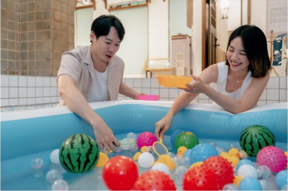 北投溫泉博物館(溫博館)再現趣味祭典遊戲,首次將將夜市撈金魚的經典玩法搬進了澡堂,只要憑限定「北投納涼劵」,可選擇體驗9款「北投味遊戲」!