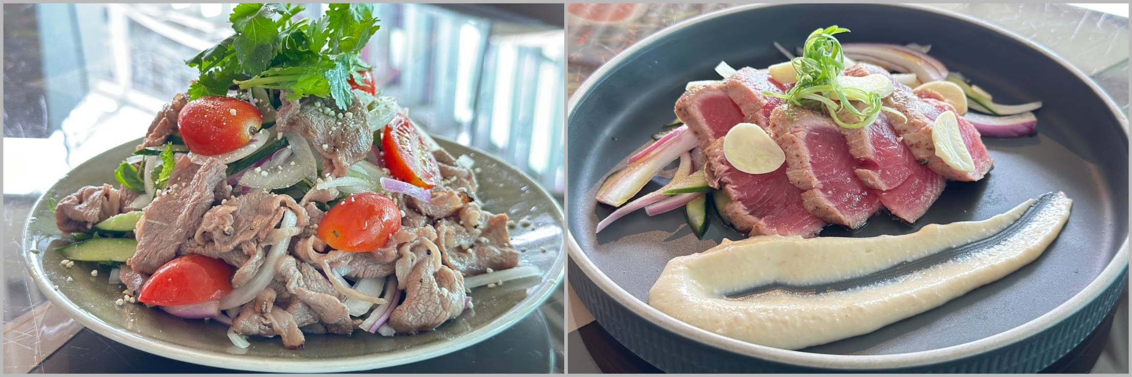 ▲泰北瀑布烤牛沙拉及鰹魚半敲燒。( 圖 業者提供 )