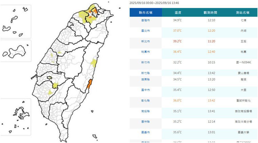 今天9月16日各地天氣高溫炎熱,氣象署發布高溫資訊顯示,白天新北市有38度極端高溫的機率,上午11時20分在五股已經飆出39.2度的高溫;臺北市、臺東縣,有連續3天出現36度以上高溫的機率;桃園市、臺中市、彰化縣、嘉義縣市、臺南市、花蓮縣也有36度以上的高溫,請注意防曬、多補充水份、慎防熱傷害。