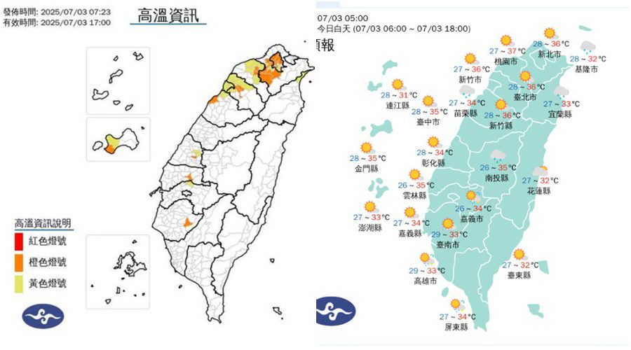 7月3日各地天氣晴朗炎熱,白天新竹縣有38度極端高溫出現的機率;臺北市、新北市、桃園市、苗栗縣、彰化縣、雲林縣、臺南市、金門縣有連續出現36度高溫的機率,請加強注意。新竹市、嘉義縣、宜蘭縣亦為36度以上黃色燈號,請注意。