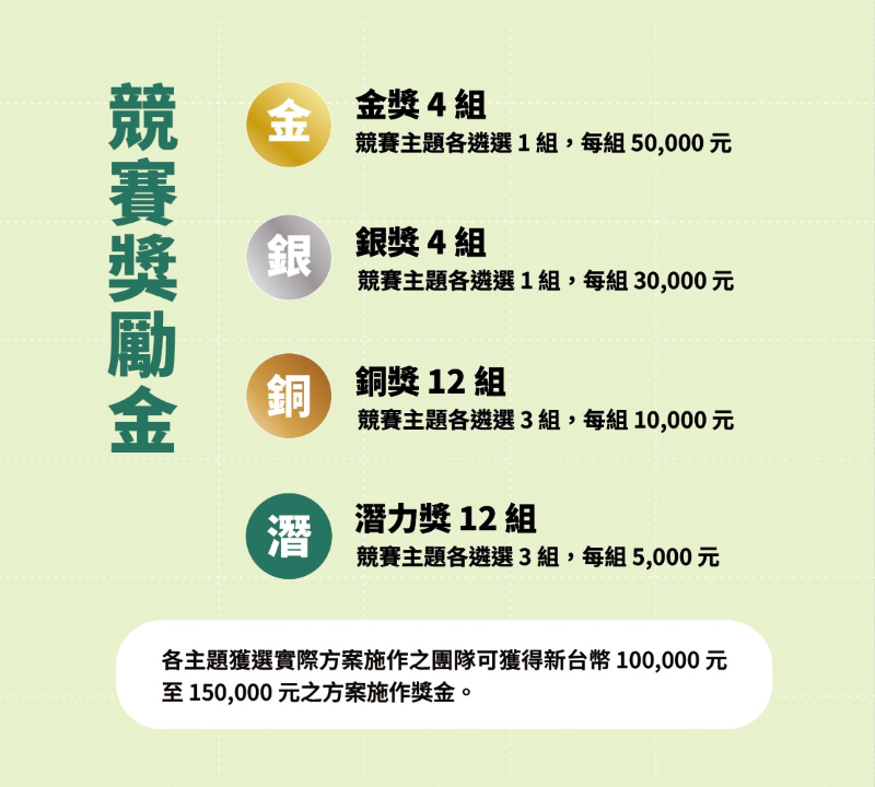 縣府表示,活動自6月7日說明會揭開序幕,接著以不同主題陸續舉辦專題講座、培訓工作坊與提案競賽,每隊需全程參與才能進入評選階段。入圍團隊除可獲獎金外,還有機會獲選參與後續方案實作,並在11月8日聯合成果展中向大眾發表成果。