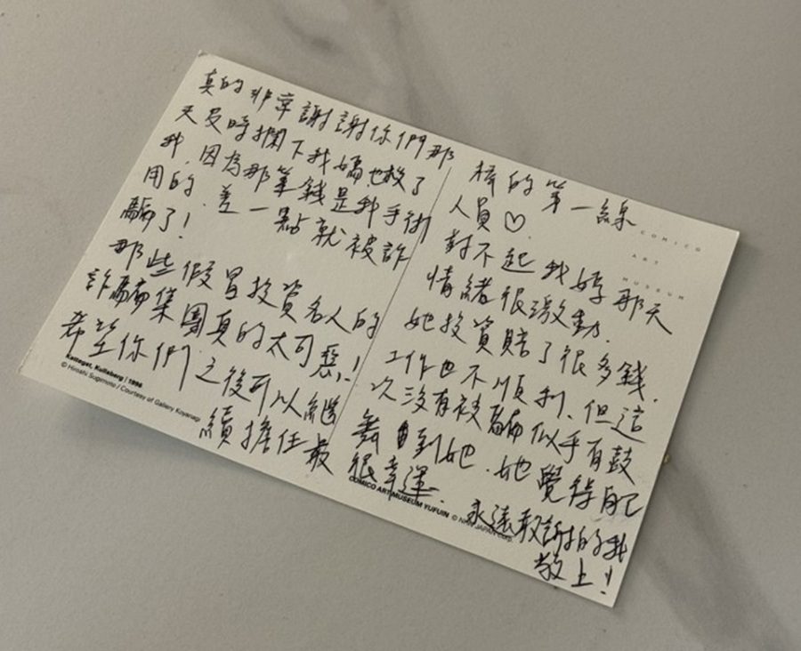 原PO表示,當時一位婦人要匯款給自稱投資「老師」的人,他立即警覺有異,耐心關懷並婉拒匯款,沒想到對方卻當場失控大鬧。隔天,婦人竟帶著女兒回到銀行,女兒一進門就哭著鞠躬道謝,說那筆錢其實是她準備的「救命開刀費」,如果被騙走後果不堪設想。她還送上手寫感謝卡,讓他深受感動。也讓他明白了這份工作真正的價值,即使壓力再大,能守住一個家庭,一切都值得。