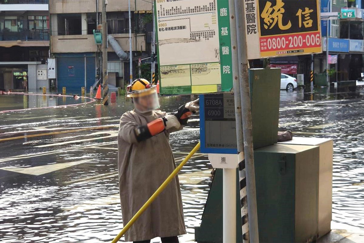 ▲在這次丹娜絲颱風中,彰基體系鹿基醫院也受到水災的影響停電,台電人員冒雨前往搶修覆電。(圖/彰基提供)