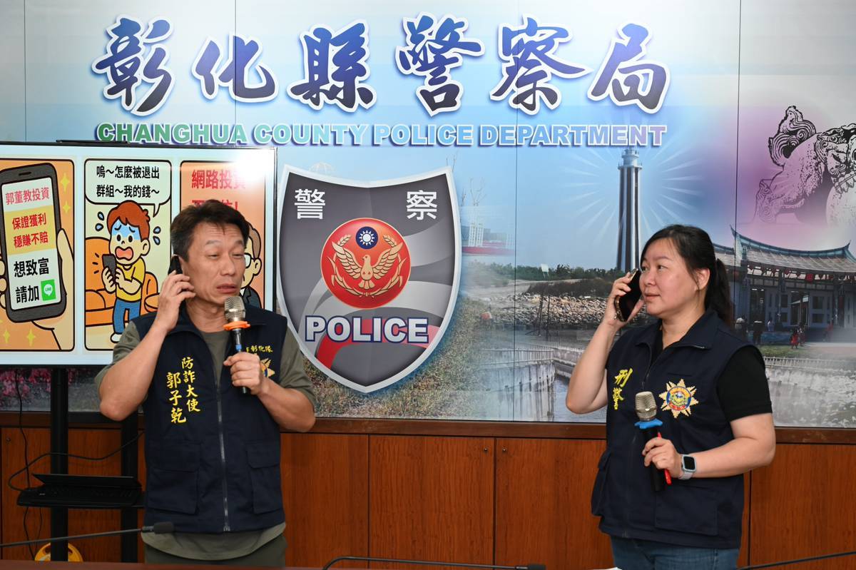 ▲郭子乾以幽默方式演繹詐騙情境,呼籲民眾留意網路訊息,千萬別聽信網友、名人、財經名嘴、理財專家會教人投資賺錢。(圖/彰縣警察局提供)