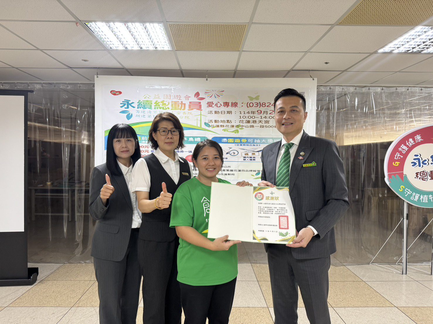 ▲創世花蓮分會院長游家慈贈狀感謝永慶房產集團花蓮區四品牌經管會長劉協誠。(圖/創世花蓮分會提供,下同)