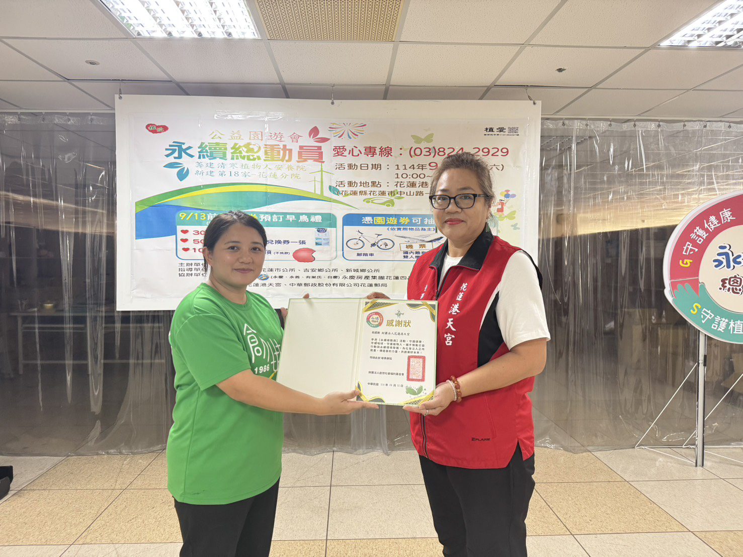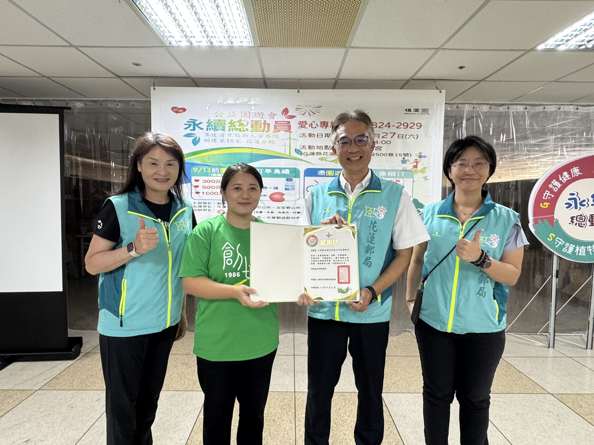 ▲創世花蓮分會院長游家慈贈狀感謝中華郵政花蓮郵局局長簡佳旺。