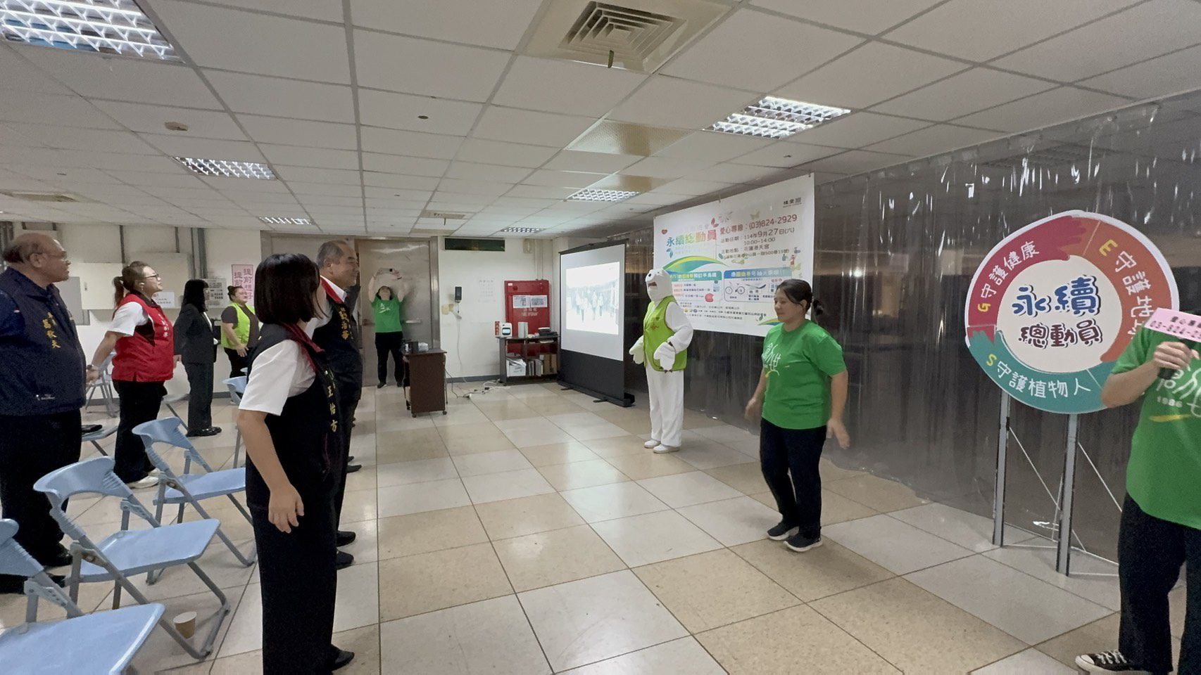 ▲與會人士與創世永續小尖兵北極熊,齊跳創世樂活操。