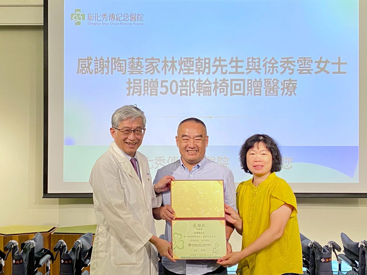 知名陶藝家林煙朝先生,不僅以其精湛的陶藝作品舉辦多場個展,廣受民眾喜愛,更長年致力於公益慈善,以藝術轉化為溫暖的力量。林先生感念彰化秀傳醫院長期的貼心服務,於今(9/23)日特別捐贈50部輪椅回饋醫院,期望能改善行動不便病人的就醫體驗,將這份溫暖延續給更多需要幫助的人。
