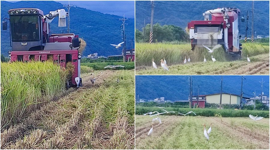 伴隨著農機的引擎聲,不時可見白鷺鷥、麻雀與烏秋成群飛臨,大大方方的趁機享受現成的美食,包括掉落的稻榖、驚飛而起或失去藏身之處的蟲蟲,一律啄食下肚。農民表示,今年稻穗飽滿,代表氣候與耕作管理皆達到良好平衡,趁著天氣尚未變壞,得加緊收割了。。