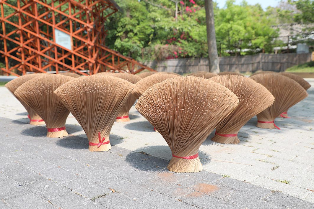 今年的剖香腳展演活動,由唯一傳承人且具60年以上剖香腳經驗的邱錦雲老師親自示範。透過邱老師熟練的鋸竹、剖片及剖絲技藝操作下,每根竹筒能剖出一千多支細長的香腳,再將它們捆成一束束的香腳花,形成一朵朵美麗的香腳花束。隨後,由製香師傅蔡增成負責進行製香過程,利用各種的中藥材料混合而製成香粉,手工沾裹香腳,這一過程需多次反覆進行,將每一支香腳均勻地塗抹,完成後的香枝香氣四溢,供應祭拜使用。