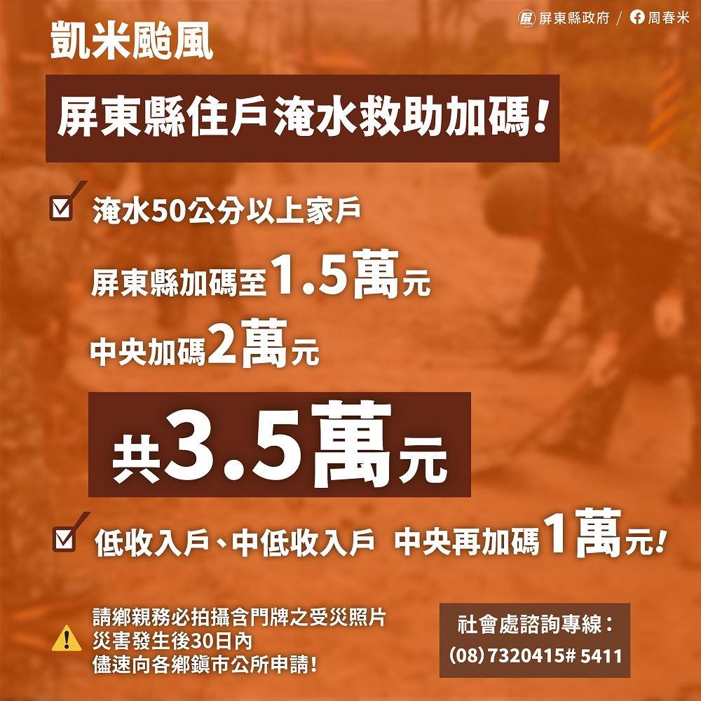 【記者蔡保泰/屏東報導】 為盡快協助民眾災後重建,屏東縣長周春米29日宣佈,住戶淹水救助屏東縣政府專案加碼,淹水50公分以上家戶加發至1.5萬元,加上中央補助可獲3.5萬元,低收入戶、中低收入戶中央加發至3萬元,含本縣本次專案淹水救助1.5萬,共可獲4.5萬元,農業災損及各項慰助一切從寬從速從簡辦理。
