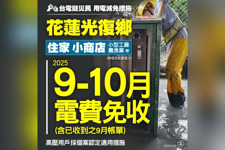 台電表示,若受災戶採高壓用電,將以個案認定適用的用電減免措施,另針對災民收容中心因收容受災戶或救災導致用電增加之電費也免予計收,期盼協助受災民眾減輕負擔,儘早重建家園。