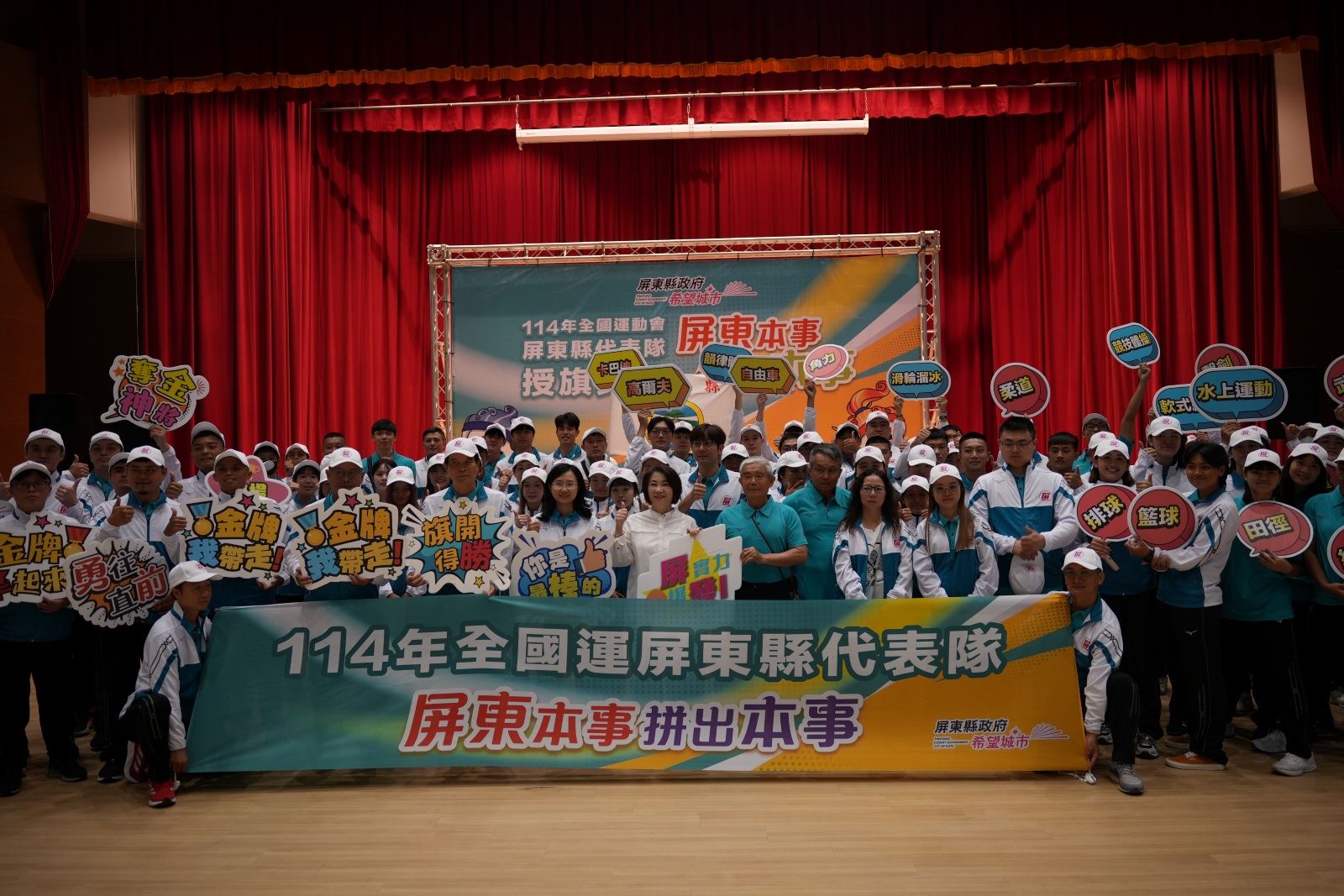 【記者戴英薇/屏東報導】 114年全國運動會將於10月18日至23日在雲林縣舉行,本屆屏東縣代表隊人數共525人,參加29種競賽項目,其中已有部分賽事提前開賽,屏縣已奪得2金,屏東縣政府今(14)日上午在縣府大禮堂舉行代表隊授旗典禮,縣長周春米預祝即將出征的代表隊選手旗開得勝,為縣爭光,帶領屏東隊突破佳績。