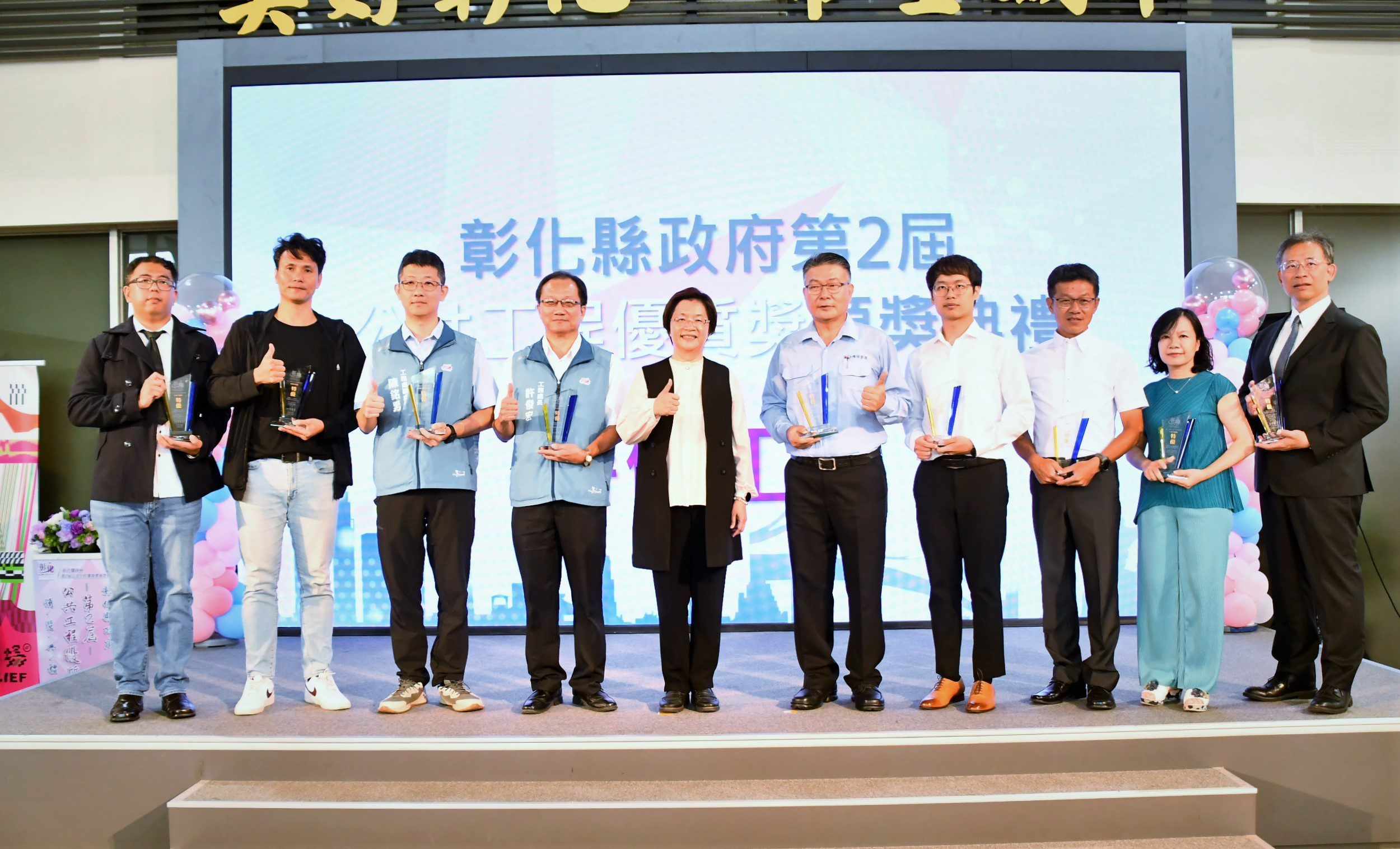 「優質淬鍊‧彰耀永傳」!彰化縣政府15日上午於縣府1樓中庭舉行第二屆「彰化縣政府公共工程優質獎」頒獎典禮,縣長王惠美親自頒獎表揚優良建設團隊。王縣長表示,本次共有35件參獎,入圍有25件,得獎的有土木、水利、建築設施及文化資產等4大類19件,其中3件特優,7件優等,9件佳作,恭喜所有脫穎而出的得獎者。也感謝各項優質公共建設的幕後英雄,藉由提升公共工程施工品質,促進廠商良性競爭,改善生活環境,彰顯彰化公共工程「優質淬鍊‧彰耀永傳」的精神。