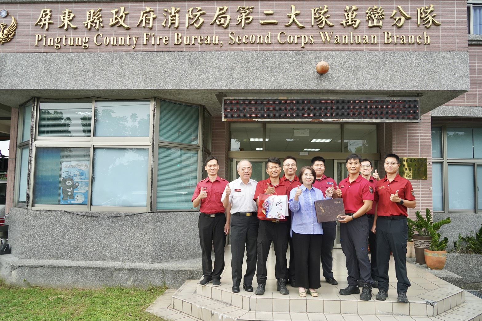 隨後,周縣長特別與萬巒消防分隊打火弟兄們進行座談,關心執勤安全,消防同仁提及分隊廳舍自97年落成至今,車庫樓頂因老化龜裂導致漏水,周縣長隨即指示消防局儘速辦理修繕及追加經費,並請分隊全面盤點設施設備,逐年汰換更新,讓同仁在執行任務時能有更安全的環境。