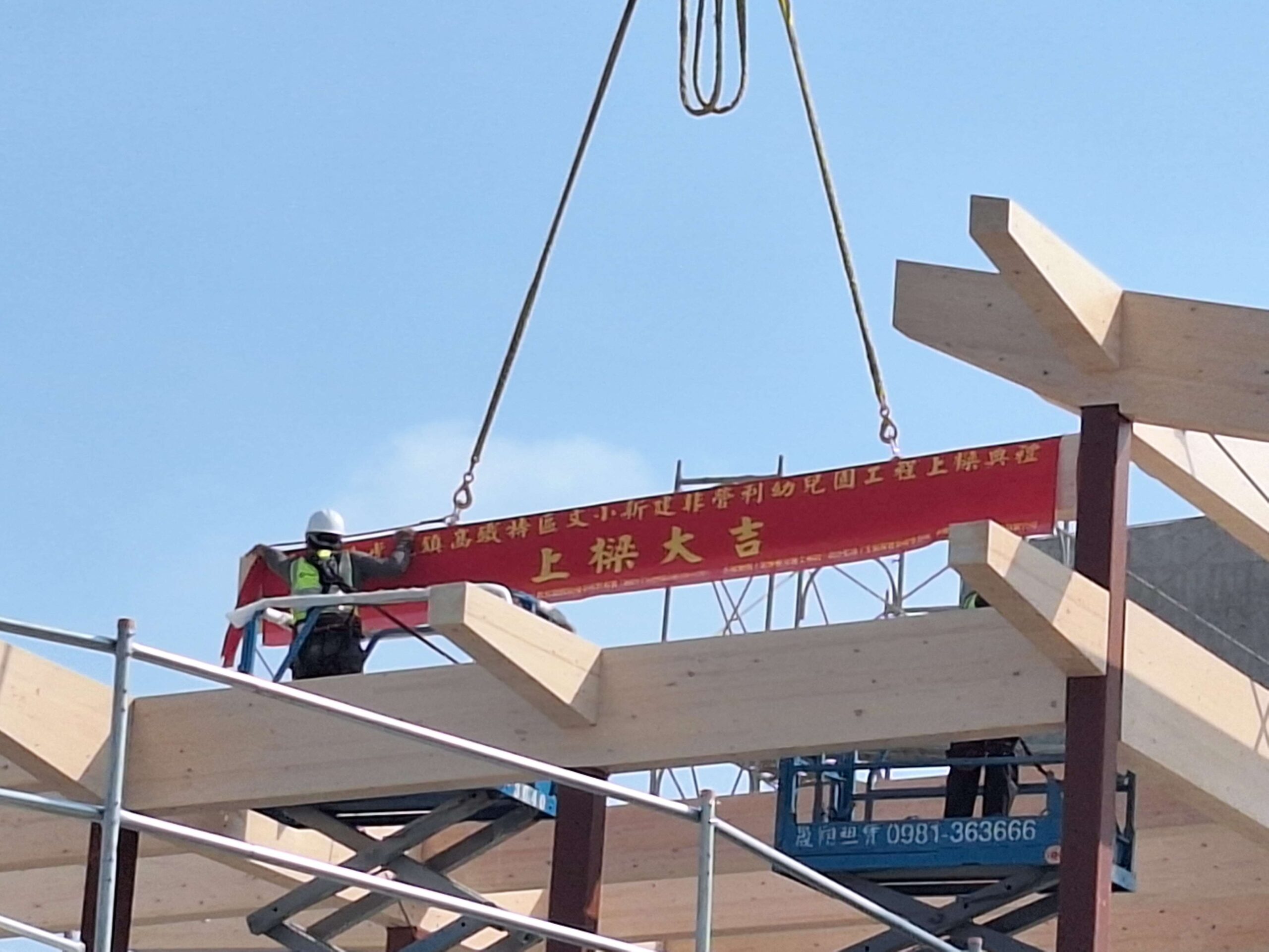 交工局長汪令堯說明,「高鐵特區文小新建非營利幼兒園工程」係由本局代辦施工,工程經費1億5,898萬元,其中教育部補助8,202萬,餘7,696萬皆由縣府自籌;本案工程由王銘顯建築師設計監造,聖穎營造有限公司承攬,結構形式為地上2層之鋼筋混凝土結構搭配鋼構,及木構屋頂結合,於113年10月18日開工,原訂工期450日曆天,受天侯影響及部分工期調整,展延約1.5個月,截至目前為止,工程進度已超過60%,今日完成木構上樑,達成設定的工程里程碑,預計在115年2月底前完工,配合明年度招生開園的時程。