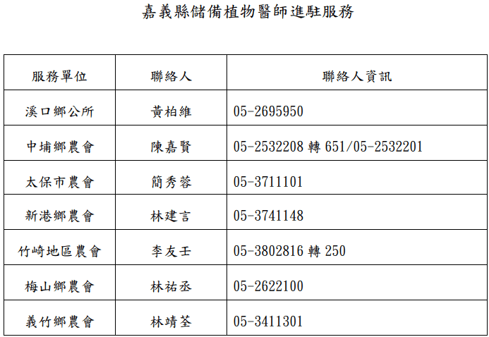 嘉義縣儲備植物醫師進駐服務地點包括:溪口鄉公所、中埔、太保、新港、義竹、梅山及竹崎農會。